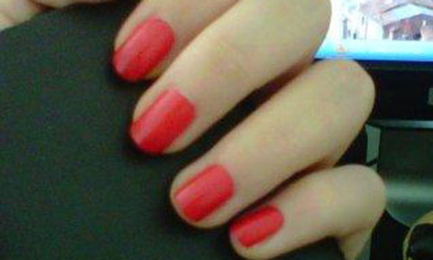 Kısa tırnaklara sürülen koyu kırmızı ojeyi hem gündüz işe giderken,