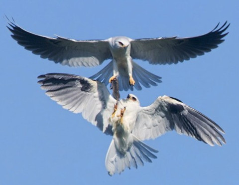 Gökyüzünde bir şahin pençelerinin yardımıyla fare yakalayan diğer bir şahinden avını almaya çalışıyor. Gökyüzünde av kavgası objektiflere böyle yansıdı.