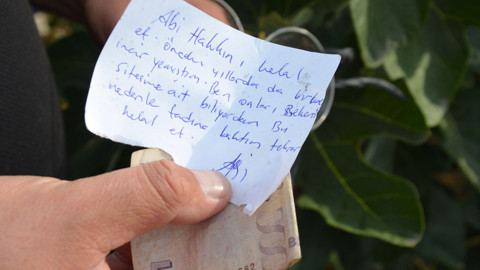 Hacı Hamza Mahallesi Sıtma Pınar mevkisinde bir sitenin kenarında Mustafa Dağhan'a ait tarlada bulunan incir ağacının dalına asılmış plastik bir bardağın içinde, "Abi hakkını helal et. Önceki yıllarda da birkaç incir yemiştim. Ben onları siteme ait biliyordum. Bu nedenle tadına baktım. Helal et." yazılı not ve 5 lira bulundu.Notu ve parayı bulan çocuklar, tarla sahibi Mustafa Dağhan'a haber verdi.Sonuna kadar helal olsun: Notu alan Mustafa Dağhan duygulandığını ve şaşırdığını dile getirerek, "Hayatta böyle insanlar kaldıysa helal olsun. Bu ağaç, canı isteyen yesin diye rahmetli kayınpederim tarafından tarlamızın kenarlarına dikilmişti. Bunu bırakan incirlerden yiyen kimse, sonuna kadar helal olsun." dedi.Notu getiren çocuklara harçlık olarak verdi: Mustafa Dağhan ağaca bırakılan 5 lirayı, kendisine notu getiren çocuklara harçlık olarak verdi.