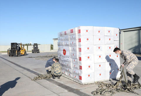 Uçaktaki heyet, Kovid-19'la mücadelede kullanılacak sağlık malzemelerini İngiliz yetkililere teslim etti.