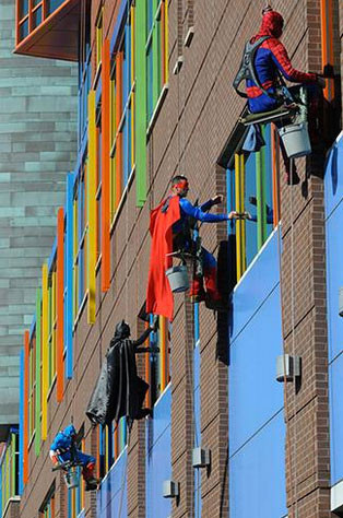 Le Bonheur Çocuk Hastanesi'nde temizleme şirketi elemanları, çocuklara moral vermek için süper kahraman kıyafetleri giyiyorlar.