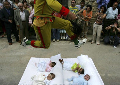 İspanya'nın kuzeyindeki Castrillo kasabasında yetişkinler, "şeytanı kovmak için" bebeklerin üzerinden atlıyor.