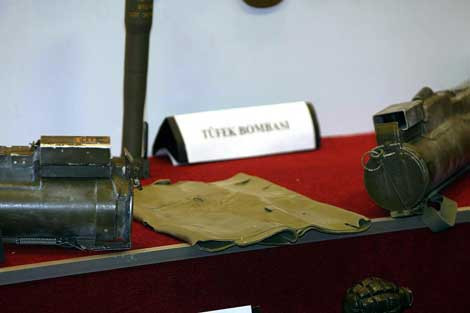 Galerinin tamamı için tıklayınız25 adet el bombası, 10 adet el bombası fünye grubu, 2 adet dolu lav silahı, 590 gram detasheet patlayıcı, 100 gram C-3 plastik patlayıcı, 130 gram C-4 patlayıcı,