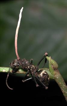 Galerinin tamamı için tıklayınızBir karıncayı ele geçirdikten sonra içine yerleşen mantar, karıncayı yavaş yavaş içten yemeye başlıyor. Bu noktadan sonra karınca için ölüm kaçınılmaz hale geliyor ama her şey burada bitmiyor. Çünkü mantar karıncanın beynini kemirmeye başladığında karınca amaçsız bir şekilde yürümeye başlıyor. Özellikle Tayland'ın bazı bölümlerinde görülen bu mantar türünün ele geçirdiği karıncılar daima ormanların içlerine doğru yürüdükten sonra yerden yaklaşık 25 cm yukarıdaki yapraklara dişleri ile tutunup hareketsiz kalıyorlar.