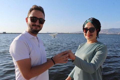 Alsancak Kordon'da gerçekleştirilen sürpriz evlilik teklifi, ilgi ve şaşkınlıkla izlendi. Ahmet Özdemir, kız arkadaşı Aynur Özdemir'le denize karşı bir bankta otururken arkadaşı dron operatörü Gani Güleç harekete geçti. Denizden gelen dronu gören Aynur Özdemir, önce ne olduğunu anlamadı.Çevredeki vatandaşlar gibi dronu ilgiyle izleyen Aynur Özdemir'e, yaklaşan hava aracından yüzük kutusunu alan Ahmet Özdemir diz çökerek evlilik teklifinde bulundu. Aynur Özdemir teklife "Evet" yanıtı verdi.Evlenme teklifiyle ilgili konuşan Ahmet Özdemir, "Bir anda aklıma geldi. Ne yapabilirim diye düşünüyordum. Sonra Gani Güleç'le konuştuk. Böyle bir evlenme teklifi planladık" dedi. Aynur Özdemir ise, "Ne olduğunu anlamaya çalıştım. Çok şaşırdım. Hiç beklemiyordum. Ama güzeldi" dedi.
