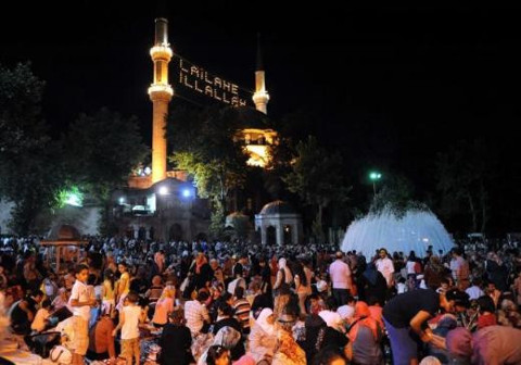 Yoğun kalabalık nedeniyle camilerde yer bulamayanlar caminin çevresinde iftar yaptı. Cami girişlerinde de izdiham oluştu.