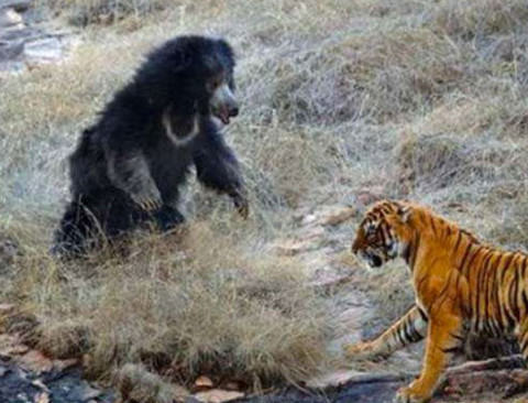 Ormanlık alanda karşı karşıya gelen kaplanla ayı birbirine girdi. Yavrularını korumak isteyen dişi Ayı Kaplan'ın önüne çıktı İki büyük yırtıcının karşılaşması ilginç anlara sahne oldu Ayı, Kaplan'ın üstüne giderek onu geri püskürttü.