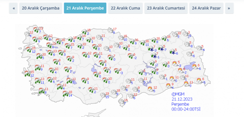 Meteoroloji Genel Müdürlüğü, 20 Aralık Çarşamba günü hava durumu raporunu yayımladı. Türkiye perşembe gününden itibaren yeni bir soğuk hava dalgasının etkisi altına girecek. Son tahminlere gör birçok ilde kuvvetli sağanak ve kar yağışının etkili olması bekleniyor. İşte illere göre 5 günlük hava durumu tahmini...Meteoroloji Genel Müdürlüğü'nün (MGM) son değerlendirmelerine göre; yurt genelinde perşembe gününden itibaren yeni bir soğuk hava dalgası etkili olacak. Son verilere göre; birçok ilde kuvvetli sağanak ve kar yağışının etkili olması bekleniyor.Sıcaklıkların ülke genelinde mevsim normalleri civarında, doğu kesimlerde yer yer mevsim normallerinin altında seyredeceği tahmin ediliyor.Öğle saatlerinden itibaren Muğla, Aydın il geneli, İzmir ve Balıkesir'in batısı ile Çanakkale'nin güney ilçelerinin aralıklı sağanak ve gökğürültülü sağanak yağışlı geçeceği tahmin ediliyor. Sabah saatlerinde iç ve doğu kesimlerde yer yer pus ve sis görülmesi bekleniyor.Perşembe gününe dikkat Perşembe gününden itibaren yurt genelinde sağanak yağışın yurt genelinde etkili olması bekleniyor. Yer yer kimi illerde ise kar ve karla karışık yağmurun etkili olacağı öngörülüyor.