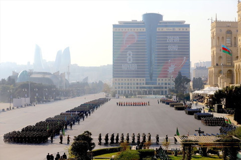 Galerinin tamamı için tıklayınızAzadlık Meydanı'ndaki töreni Azerbaycan Cumhurbaşkanı İlham Aliyev, Cumhurbaşkanı Recep Tayyip Erdoğan ve Pakistan Başbakanı Şahbaz Şerif birlikte izledi. Tören, üç ülkenin milli marşlarının çalınması ve 44 günlük savaşta şehit olan askerler için bir dakikalık saygı duruşuyla başladı.