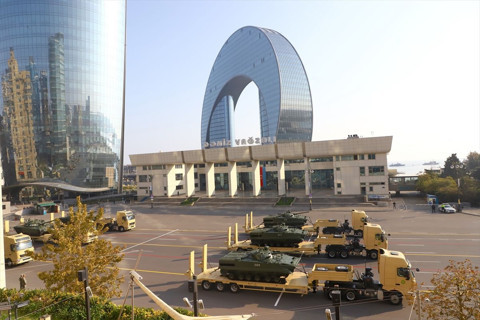 Galerinin tamamı için tıklayınızSavunma Bakanı Zakir Hasanov'un tekmil verdiği sırada Cumhurbaşkanı Aliyev, "Selam asker" hitabıyla birlikleri selamladı ve liderler, kendilerine ayrılan bölümden töreni takip etti.