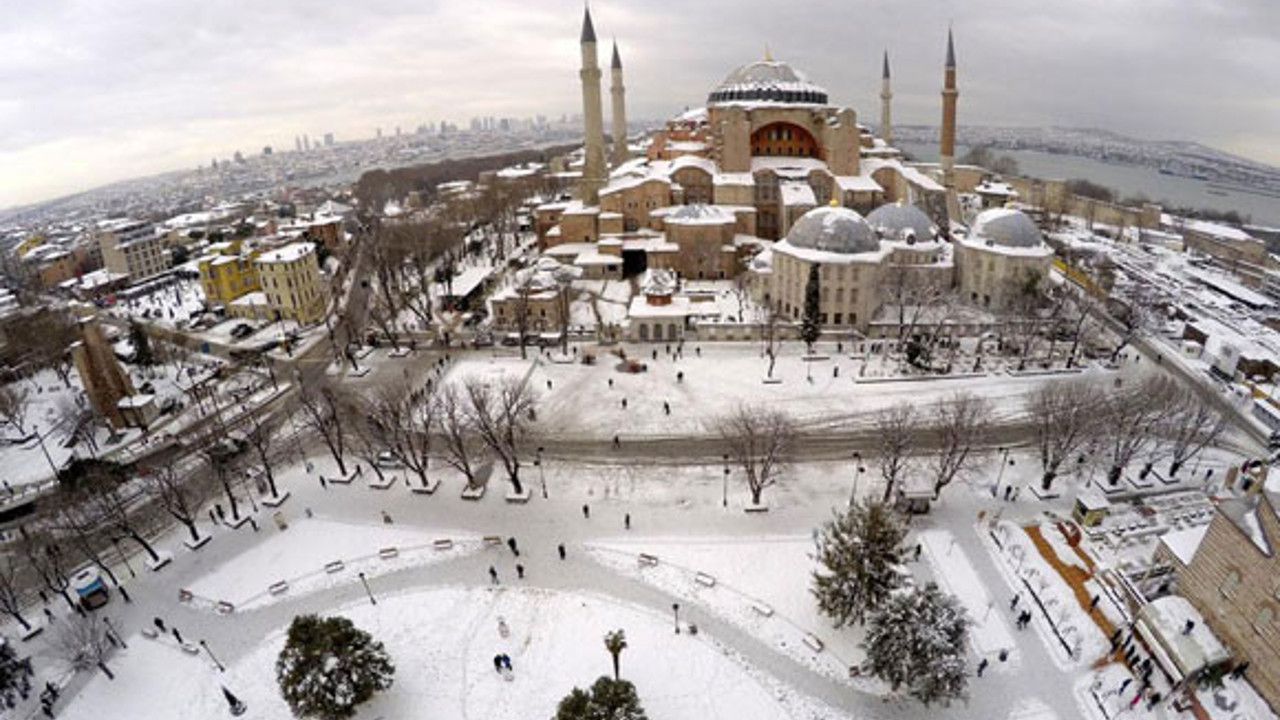 İstanbul'da etkili olan kar yağışının ardından eşsiz güzellikte görüntüler oluştu. Fotoğrafta Ayasoyfa Müzesi görülüyor. Sultanahmet Meydanı Sultanahmet Camii Sultanahmet Camii