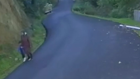 Görüntülerde, anne ve oğlunun yol kenarından yavaş yavaş yürüdüğü, annenin sırtında bir çanta olduğu görülüyor.