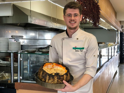 Galerinin tamamı için tıklayınızBAL KABAĞINDA SÜT HELVASI Araştırmaları neticesinde Osmanlı mutfağında bir aşçının bal kabağı içinde farklı yemekler pişirdiğine rastlayan Topuk, "Buradan esinlenerek süt helvasını bal kabağının içinde pişirsek nasıl olur diye düşündüm. Ortaya mükemmel bir sonuç çıktı. Her öğlen mutlaka bal kabağında süt helvası pişiriyoruz. Açıkçası bal kabağında yaptığımız, tepside yapılan süt helvası ile yarışır hale geldi. Bu yüzyılda böyle bir yorumu ortaya çıkarmaktan dolayı çok mutluyuz. Yapılışı ise normal süt helvasına göre daha zahmetli. 1 gece boyunca bal kabağını fırında pişiriyoruz. Sabah ise içinde şerbetli bal kabağı tatlısı pişiriyoruz. Daha sonra içerisine süt helvasını ekleyip, bal kabağı içinde fırınlıyoruz. Sunumda ise helvayı bal kabağı ile servis ediyoruz" dedi.