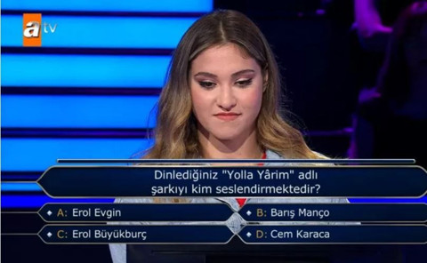 Galerinin tamamı için tıklayınız7.500 TL değerinde 5.soruya ulaşmayı başaran genç yarışmacı, "Dinlediğiniz Yolla Yarim adlı şarkıyı kim seslendirmektedir?" sorusunu görünce büyük bir panik yaşadı.