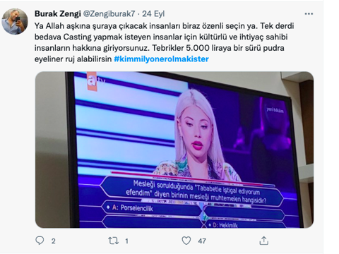 Dün akşam ATV ekranlarında televizyonların en çok kazandıran bilgi yarışması Kim Milyoner Olmak İster vardı. Yarışmaya katılanlardan biri de İstanbul Üniversitesi Tıp Fakültesi öğrencisi Duygu Dilbaz oldu. Uluslararası bir matematik yarışmasında üst üste iki kez dünya üçüncülüğü kazandığını ifade eden İstanbul Üniversitesi Tıp Fakültesi öğrencisi Duygu Dilbaz isimli yarışmacının 3. soruya verdiği yanıt olay oldu.Dilbaz kendini tanıttığı sırada, çeşitli uluslararası yarışmalara katıldığını ifade etti. Dilbaz, Rusya'da düzenlenen bir matematik yarışmasında da iki kez üst üste dünya üçüncülüğü kazandığını söyledi.İkinci soruda joker hakkını kullandı: İlk soruda "Saklambaç oynayan çocuklar 'Elma dersem çık' dedikleri arkadaşlarına 'armut dersem" dedikten sonra genellikle hangisini söylerler?" sorusunu "Çıkma" diyerek kolaylıkla yanıtlayan Dilbaz, ikinci soruyu ise "seyirciye sorma" hakkını kullanarak geçti.Metrobüs cevabı eledi: Üçüncü soruda ise Dilbaz, "Filika, genellikle hangi araçta bulunur?" sorusu ile karşılaştı. Ancak gemi, tren, uçak ve metrobüs şıkları arasından "Metrobüs" cevabını seçerek yanlış cevabı vermiş oldu.İşte dünya sosyal medyadan gelen tepkilerin bazıları