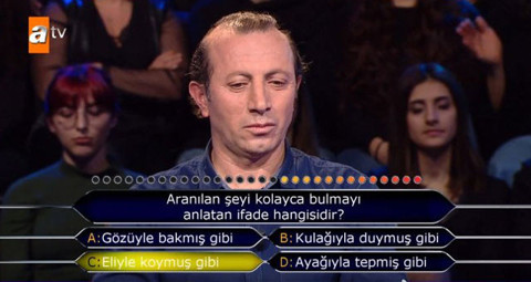 Galerinin tamamı için tıklayınızİkinci soru ise; "Aranılan şeyi kolayca bulmayı anlatan ifade hangidir?" oldu. Cuma Bey C şıkkı 'Eliyle koymuş gibi' yanıtını vererek bu soruda da doğru cevabı bulmayı başardı.