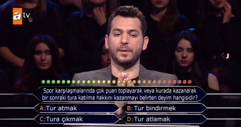 Galerinin tamamı için tıklayınızCuma Bey ardından "Spor karşılaşmalarında çok puan toplayarak veya kurada kazanarak bir sonraki tura katılma hakkını kazanmayı belirten deyim hangisidir?" sorusuyla karşılaştı. Bu soruya da doğru cevap olan 'Tur atlamak' yanıtını vererek 4. soruya geçmeye hak kazandı.