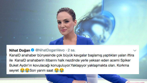 Galerinin tamamı için tıklayınızEYY BUKET HANIM! : Nihat Doğan öğleden sonra da twitter kanalına geçti ve bu kez doğrudan Buket Aydın'ı hedef alan şu twitleri attı: -KanalD anahaber bünyesinde çok büyük kavgalar başlamış.yaptıkları yalan iftira ile KanalD anahaberin itibarını halk nezdinde yerle yeksan eden acemi Spiker Buket Aydın’ın kovulacağı konuşuluyor.Yaklaşıyor yaklaşmakta olan. Korkma seyret 😂😂Son yarım saat 😂😂