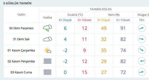 TÜRKİYE Balkanlar üzerinden gelen soğuk ve yağışlı havanın etkisine girerken kış kapıya dayandı. Meteorolojinin yayınladığı son hava durumu tahminine göre sıcaklık mevsim normallerinin de altına indi. Bu hafta sonuna kadar soğuk havanın ülkemizin büyük bir bölümünde etkili olması bekleniyor. Bugün için yapılan hava durumu tahmininde ise Marmara'nın güney ve doğusu, Doğu Akdeniz, İç Anadolu'nun kuzeyi, Karadeniz, Doğu ve Güneydoğu Anadolu ile Kütahya çevrelerinin yağışlı geçeceği tahmin ediliyor. Doğu Karadeniz'in iç kesimlerinin ve Doğu Anadolu’nun doğusunun yükseklerinde karla karışık yağmur ve kar yağışı bekleniyor. İşte illerin 5 günlük hava durumu tahmini; Ankara hava durumu 5 günlük meteoroloji tahmini Adana hava durumu 5 günlük meteoroloji tahmini Antalya hava durumu 5 günlük meteoroloji tahmini Balıkesir hava durumu 5 günlük meteoroloji tahmini Bursa hava durumu 5 günlük meteoroloji tahmini Diyarbakır hava durumu 5 günlük meteoroloji tahmini Erzurum hava durumu 5 günlük meteoroloji tahmini İstanbul hava durumu 5 günlük meteoroloji tahmini İzmir hava durumu 5 günlük meteoroloji tahmini Konya hava durumu 5 günlük meteoroloji tahmini Sakarya hava durumu 5 günlük meteoroloji tahmini Van hava durumu 5 günlük meteoroloji tahmini