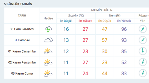 TÜRKİYE Balkanlar üzerinden gelen soğuk ve yağışlı havanın etkisine girerken kış kapıya dayandı. Meteorolojinin yayınladığı son hava durumu tahminine göre sıcaklık mevsim normallerinin de altına indi. Bu hafta sonuna kadar soğuk havanın ülkemizin büyük bir bölümünde etkili olması bekleniyor. Bugün için yapılan hava durumu tahmininde ise Marmara'nın güney ve doğusu, Doğu Akdeniz, İç Anadolu'nun kuzeyi, Karadeniz, Doğu ve Güneydoğu Anadolu ile Kütahya çevrelerinin yağışlı geçeceği tahmin ediliyor. Doğu Karadeniz'in iç kesimlerinin ve Doğu Anadolu’nun doğusunun yükseklerinde karla karışık yağmur ve kar yağışı bekleniyor. İşte illerin 5 günlük hava durumu tahmini; Ankara hava durumu 5 günlük meteoroloji tahmini Adana hava durumu 5 günlük meteoroloji tahmini Antalya hava durumu 5 günlük meteoroloji tahmini Balıkesir hava durumu 5 günlük meteoroloji tahmini Bursa hava durumu 5 günlük meteoroloji tahmini Diyarbakır hava durumu 5 günlük meteoroloji tahmini Erzurum hava durumu 5 günlük meteoroloji tahmini İstanbul hava durumu 5 günlük meteoroloji tahmini İzmir hava durumu 5 günlük meteoroloji tahmini Konya hava durumu 5 günlük meteoroloji tahmini Sakarya hava durumu 5 günlük meteoroloji tahmini Van hava durumu 5 günlük meteoroloji tahmini