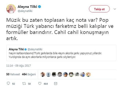 Son günlerin en çok konuşulan isimlerinden biri Aleyna Tilki. Yeni şarkısı Sen Olsan Bari ile dünya listelerine giren Aleyna Tilki'nin klibinin çalıntı olduğu iddia edilmişti. Britney Spears'in bir klibiyle benzerlik göstermesi nedeniyle eleştirilen Aleyna Tilki'nin bu kez şarkısının çalıntı olduğunu söyleniyor. Son günlerde magazin dünyasını meşgul eden genç şarkıcı Aleyna Tilki’nin “O sen olsan bari” isimli son şarkısının Ed Sheeran’ın Shape of You şarkısından alıntılandığı iddia edildi. İki şarkı arasında kulağa ilginç gelen benzerliklerin yanı sıra teknik olarak da aynı özelliklerin olması dikkat çekti. Müzisyen Onur Güler, Youtube kanalından, söz ve müziği Ersay Üner’e, düzenlemesi Ozan Çolakoğlu’na ait olan "Sen Olsan Bari" isimli çalışma ile Ed Sheeran - Shape of You şarkısının birbirlerine olan benzerliklerini anlattı. Güler’e göre iki şarkının tonu, BPM'i (hızı), düzenlemesi ve aranjesi dahil birçok benzerlikler bulunuyor. İki şarkının müziklerini ve vokallerini kayıt programında ayırıp çeşitli şekillerde birlikte çalan Onur Güler’in bu çalışmasıyla iki şarkının arasındaki dikkat çeken benzerlikleri açığa çıkıyor. ALEYNA TİLKİ AÇIKLAMA YAPTI Daha sonra Aleyna Tilki, Twitter hesabı üzerinden yaptığı açıklama da," Neyin kafasındasınız? Türk şarkılarda bile 4 aynı akorla şarkı yapıyoruz yıllardır. Yurt dışında da aynı akorlarla milyonlarca şarkı söyleniyor! Müzik bu zaten toplasan kaç nota var? Pop müziği Türk yabancı farketmez belli kalıplar ve formüller barındırır. Cahil cahil konuşmayın artık” diye açıklama yaptı.