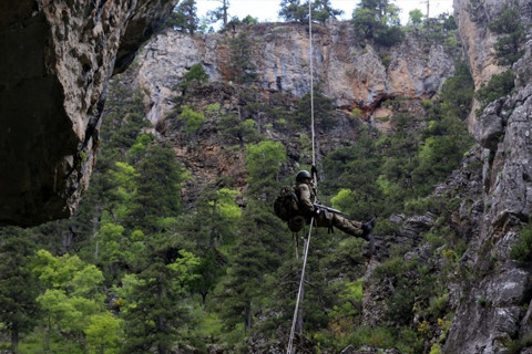 Galerinin tamamı için tıklayınızDAĞCILIK TEKNİĞİYLE TIRMANIYORLAR Karaburun bölgesinde bulunan ve dağcılık konusunda dünyanın en büyük eğitim kulesine ileri dağcılık teknikleri ile tırmanan komandolar, 76 metredeki kuleden çeşitli yöntemlerle indikten sonra aynı bölgedeki özel parkurları geçti.