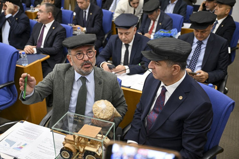 Galerinin tamamı için tıklayınızToplantı öncesinde CHP milletvekilleri kasket taktı, CHP sıralarındaki masalara traktör maketi, sebzeler, pamuk ve bir şişe mazot konularak tarım politikalarına eleştirilerde bulunuldu.