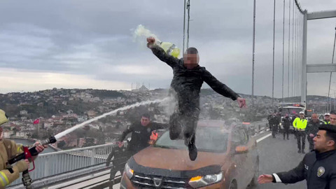 15 Temmuz Şehitler Köprüsünde durdurduğu otomobilinin üzerine çıkıp kendisinin ve aracının üzerine benzin döken şahıs ekipleri harekete geçirdi. Polisin ikna çabaları, şahsı otomobilin üzerinden indirmeye yetmeyince itfaiye eri şahsın üzerine hortum ile su sıktı. Üzerine su sıkılmasına öfkelenen şahıs itfaiyecilerin üzerine doğru koşmak isteyince otomobilden yere düştü. Şahıs yere düşünce polis tarafından yakalandı. 15 Temmuz Şehitler Köprüsünde Anadolu Yakasından Avrupa Yakasına geçiş istikametinde ilerleyen bir otomobil sürücüsü, köprünün ortasında otomobilini durdurup tavanına çıktı. Şahıs elinde bulunan şişe içerisindeki benzin benzeri maddeyi kendi üzerine ve otomobilin üzerine döktü. Olay yerine polis, itfaiye ve sağlık ekipleri sevk edildi. İŞTE KÖPRÜDEKİ HAREKETLİ ANLARIN VİDEOSUPolis, otomobil üzerindeki şahsı ikna etmek için çaba sarf etse de şahıs elindeki şişeyi bırakıp aracın üzerinden inmeye ikna olmadı.Bunun üzerine itfaiye eri tarafından otomobil üzerindeki şahsa hortum ile su sıkıldı. Kendisine su sıkılmasına öfkelenen şahıs elindeki şişe ile beraber itfaiyecilere doğru koşmak isteyince otomobilin üzerinden yere düştü. Yere düşen şahıs polis tarafından yakalanarak polis merkezine götürüldü. Neden böyle bir eyleme giriştiği ise anlaşılamadı...