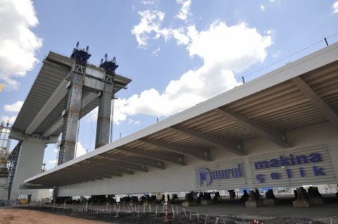 Galerinin tamamı için tıklayınızÇelik tabliye, yerden yaklaşık 3 santimetre yükseltilerek son testleri yapılmak üzere viyadüğün 1 ve 2 numaralı ayakları arasında askıya alındı.