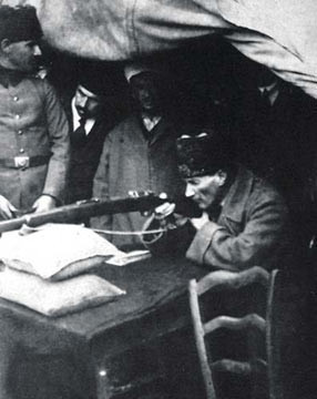Galerinin tamamı için tıklayınızBu fotoğraflardan birinde Atatürk cephede silahıyla birlikte görülüyor.