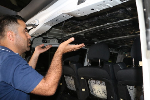 Jandarmaya ait narkotik köpeğiyle yapılan arama sırasında, şüphe üzerine minibüs detaylı arama için emniyet bünyesindeki tamirhaneye çekildi.