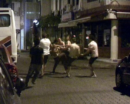 Galerinin tamamı için tıklayınızMuğla’nın Marmaris İlçesi’ndeki bir barda yer kavgasına tutuşunca bar personeli tarafından dışarı çıkartılan üniversite öğrencisi 3 İngiliz turist, tartıştıkları 3 Türk tarafından dekme ve yumruklarla hastanelik oluncaya kadar dövüldü. Sokak ortasındaki kavga, saniye saniye kameralara yansıdı.