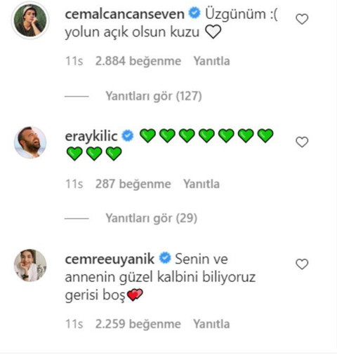 Galerinin tamamı için tıklayınızMasterchef Gülşah’ın veda paylaşımının sonrasında Masterchef 2019 şampiyonu Cemre Uyanık, ''Senin ve annenin kalbini biliyoruz gerisi boş'' yorumunu ekledi. Gülşah Suna’nın fotoğrafına bir yorum da Survivor 2020 şampiyonu Cemal Can Cansever’den geldi. Survivor şampiyonu Cemal Can, “Üzgünüm. Yolun açık olsun kuzum” yorumunu yaptı.