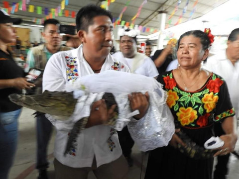 Galerinin tamamı için tıklayınızMeksika’nın Oaxaca eyaletinde yer alan San Pedro Huamelula’nın Belediye Başkanı Victor Hugo Sosa Garcia halkına şans, bolluk ve refah getirmesi için Alicia Adriana adlı timsahla evlendi.