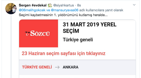 Galerinin tamamı için tıklayınızMelih Gökçek'in Mansur Yavaş'ı stalklarken yakalandığı tarih de çok dikkat çekti. 31 Mart yerel seçimlerinin yıldönümü olduğunu hatırlatan bir kullanıcı Gökçek için "Seçimli kaybetmesinin 1. yıldönümünü kutlamış herhalde" göndermesi yaptı.