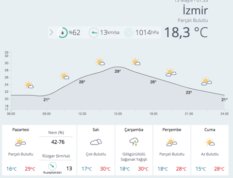 Meteoroloji Genel Müdürlüğü tarafından yapılan son değerlendirmelere göre; Ülkemizin kuzey kesimlerinin parçalı ve çok bulutlu, Edirne, Kırklareli, Artvin ve Ardahan çevreleri ile Çanakkale’nin batı kesimlerinin yerel olarak sağanak yağışlı, diğer yerlerin az bulutlu ve açık geçeceği tahmin ediliyor. Bu sabah saatlerinde Marmara'nın kuzey kesimlerinde yer yer pus bekleniyor.Ülkemiz genelinde 2 ila 5 derece artacağı tahmin ediliyor.Genellikle kuzey ve kuzeydoğu, güney ve doğu kesimler ile zamanla batı bölgelerde güney ve güneybatı yönlerden hafif, ara sıra orta kuvvette eseceği tahmin ediliyor.Marmara Parçalı ve çok bulutlu, Edirne, Kırklareli çevreleri ile Çanakkale’nin batı kesimlerinin yerel olarak sağanak yağışlı geçeceği tahmin ediliyor. Kuzey kesimlerinde sabah saatlerinde yer yer pus bekleniyor. Bursa °C, 28°CParçalı ve az bulutlu Çanakkale °C, 25°CParçalı ve az bulutlu İstanbul °C, 19°CParçalı ve az bulutlu, kuzey kesimleri yer yer çok bulutlu, sabah saatlerinde puslu Kırklareli °C, 22°CParçalı ve az bulutlu, zamanla çok bulutlu ve gece saatlerinde sağanak yağışlıEge Parçalı ve az bulutlu geçeceği tahmin ediliyor. A.Karahisar °C, 23°CParçalı ve az bulutlu Denizli °C, 29°CParçalı ve az bulutlu İzmir °C, 29°CAz bulutlu Muğla °C, 26°CAz bulutluAkdeniz Az bulutlu ve açık, iç kesimlerinin yer yer parçalı bulutlu geçeceği tahmin ediliyor. Adana °C, 32°CAz bulutlu Antalya °C, 24°CAz bulutlu ve açık Hatay °C, 30°CAz bulutlu Isparta°C, 23°CParçalı ve az bulutluİç Anadolu Parçalı ve az bulutlu geçeceği tahmin ediliyor. Ankara °C, 24°CParçalı ve az bulutlu Eskişehir °C, 25°CParçalı ve az bulutlu Konya °C, 24°CParçalı ve az bulutlu Sivas °C, 21°CParçalı ve az bulutluBatı Karadeniz Parçalı ve az bulutlu geçeceği tahmin ediliyor. Bolu °C, 23°CParçalı ve az bulutlu Düzce °C, 27°CParçalı ve az bulutlu Sinop °C, 19°CParçalı ve az bulutlu Zonguldak °C, 21°CParçalı ve az bulutluOrta ve Doğu Karadeniz Parçalı, doğusunun yer yer çok bulutlu ve Artvin çevrelerinin akşam saatlerine kadar yerel olmak üzere sağanak yağışlı geçeceği tahmin ediliyor. Amasya °C, 24°CParçalı bulutlu Bayburt °C, 18°CParçalı ve çok bulutlu Samsun °C, 19°CParçalı bulutlu Trabzon °C, 18°CParçalı ve çok bulutluDoğu Anadolu Parçalı yer yer çok bulutlu, Ardahan çevrelerinin akşam saatlerine kadar yerel olmak üzere sağanak yağışlı geçeceği tahmin ediliyor. Erzurum °C, 16°CParçalı bulutlu Kars 4°C, 17°CParçalı ve çok bulutlu Malatya °C, 25°CParçalı bulutlu Van °C, 19°CParçalı bulutluGüneydoğu Anadolu Az bulutlu ve açık geçeceği tahmin ediliyor. Diyarbakır °C, 26°CAz bulutlu ve açık Gaziantep °C, 28°CAz bulutlu ve açık Siirt °C, 26°CAz bulutlu ve açık Şanlıurfa °C, 31°CAz bulutlu ve açık