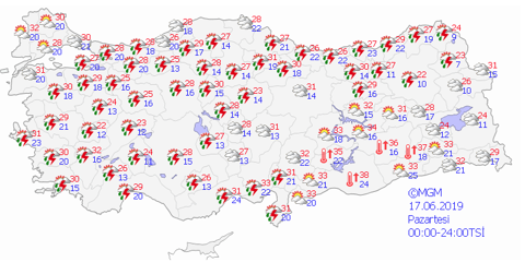 Meteoroloji'den alınan son tahminlere göre, bugün yurdun birçok kentinde sağanak yağış etkili olacak. Bazı bölgelerde kuvvetli olması beklenen yağışlarla beraber, yıldırım, dolu, yağış anında kuvvetli rüzgar, ani sel, su baskını gibi olumsuzluklara karşı da vatandaşların dikkatli olması için uyarı yapıldı. Meteoroloji Genel Müdürlüğü tarafından yapılan son değerlendirmelere göre; İç Ege, Batı Akdeniz'in iç kesimleri, Doğu Akdeniz, İç Anadolu, Karadeniz ve Doğu Anadolu'nun kuzeyi ile Sakarya ve Bilecikçevrelerinin sağanak ve gök gürültülü sağanak yağışlı, diğer yerlerin parçalı, yer yer çok bulutlu geçeceği tahmin ediliyor.Özellikle 12:00 - 18:00 saatleri arasında yağışların 32 ilde etkili olması bekleniyor. Yağışların; İç Anadolu'nun güney ve doğusu, Orta Karadeniz'in iç kesimleri, Çankırı, Sinop ve Samsun çevreleri ile Kastamonu'nun iç kesimlerinde yerel olarak kuvvetli olması bekleniyor.Yağışların yerel olarak kuvvetli olması beklendiğinden; yıldırım, dolu, yağış anında kuvvetli rüzgar, ani sel, su baskını gibi olumsuzluklara karşı dikkatli ve tedbirli olunması için uyarı yapıldı.İstanbul'da ise bugün hava güneşli ve sıcak. Cuma ve Cumartesi günü ise dün olduğu gibi lokal gök gürültülü sağanak yağışlar bekleniyor. Lokal yağışların görüleceği iki gün boyunca sıcaklık 30 derece civarında seyredecek. Pazar günü ise hava bulutlu.