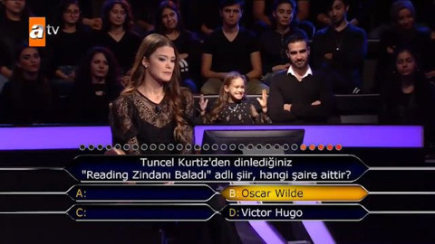 Galerinin tamamı için tıklayınızYarışmacı joker hakkını da kullanarak B) Oscar Wilde şıkkını söyleyerek doğru cevabı bildi. Ancak Tuncel Kurtiz'in sesini duyan Kenan İmirzalıoğlu, duygu dolu anlar yaşadı.