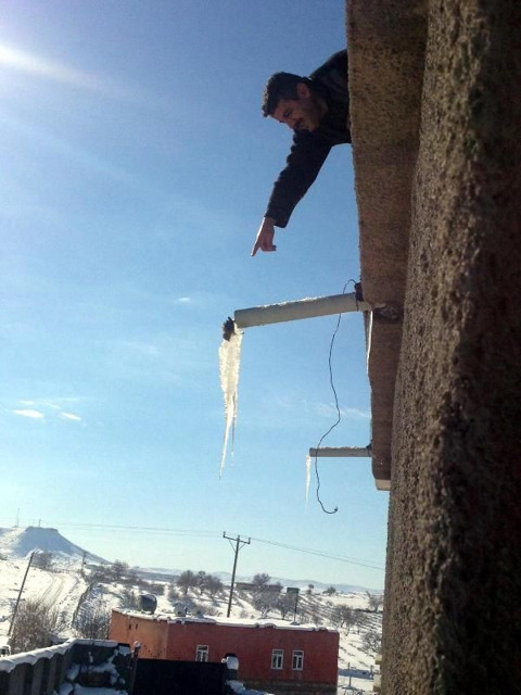 Galerinin tamamı için tıklayınızŞenyuva Köyü'nde yaşayan Şeyhmus Şan, dün sabah damda biriken kar yığınlarını temizlemeye çalışırken, serçenin oluktan akan suyla birlikte donduğunu gördü.