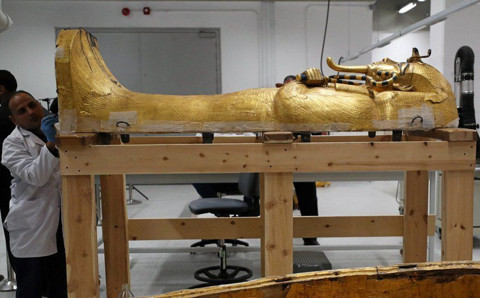 Galerinin tamamı için tıklayınız1922'de bulunduktan sonra sterilizasyon çadırında tutulan ve o zamandan beri sadece yetkili personelin gördüğü tabutun dış yüzünün fotoğrafını uluslararası ajanslar dünyaya servis etti. Tabutun dışındaki tahta parça üzerine ince bir şekilde işlemeler yapıldığı görüldü.
