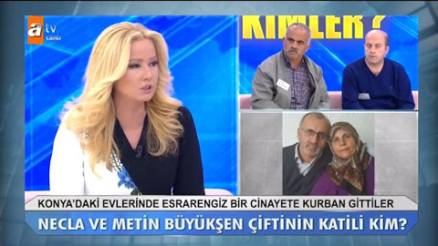Galerinin tamamı için tıklayınızOlayın ardından tam 7 ay geçti. Müge Anlı'nın programına çıkan aile vahşi cinayeti işleyen katilin bulunmasını istiyor. Programa katılan aile ise dünürlerden şüpheleniyor. İddialara göre gelinlerine mehir olarak bundan 10 yıl önce 10 dönüm tarla 120 gram altın 500 metrekare arazi verildi. Gelinleri kayın pederi Metin Büyükşen'e arsaya ev yaptırmasını istiyor. Ancak kayın peder Metin Büyükşen benim durumum yok 40 bin TL para ve bir arsa teklif ediyor ancak gelinleri kabul etmiyor.