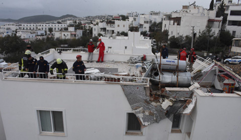 MUĞLA'nın Bodrum ilçesinde, iki katlı evin çatı katındaki buzdolabından kaynaklandığı tahmin edilen patlamada, maddi hasar oluştu. Gümbet Mahallesi Melengeç Sitesi'ndeki bir evin çatı katında patlama meydana geldi. Evin çatısı ve yan cephesinde, büyük bir gürültüyle çökme oldu. Patlamanın şiddetiyle yola savrulan beton parçaları, park halindeki bir aracın üzerine düştü. Olayda ölen ya da yaralanan olmazken ev ve otomobilde hasar oluştu. İhbar üzerine olay yerine sevk edilen polis, itfaiye, AKUT ve Muğla 911 Arama ve Kurtarma Derneği ekipleri bölgede inceleme yaptı. Polis, olay yerinde güvenlik tedbirleri aldı. Muğla 911 Arama ve Kurtarma Derneği Başkanı Cenk Ayata, çalışmaların devam ettiğini belirterek yapılan ilk değerlendirmede, patlamanın çatı katında bulunan buzdolabından kaynaklandığını tespit ettiklerini kaydetti. Patlamayı duyan site sakinlerinden Murat Soykan, "Büyük bir gürültüye uyandık. Bölgedeki bütün evler patlamanın şiddetiyle sallandı. Herkes sokağa çıktı ve panik yaşandı." dedi. Site sakinlerinden Ayhan Işık da, büyük korku yaşadıklarını, evlerinin duvarlarının bile sarsıldığını söyledi.