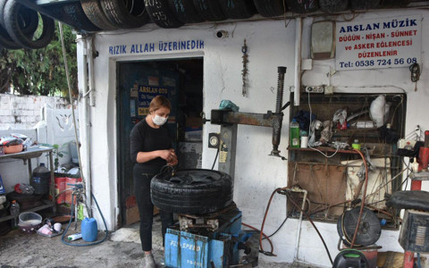 Galerinin tamamı için tıklayınız"Sonrasında da lastiklerin içerisinde buldum kendimi. Dükkana gelenler lastiği benim tamir ettiğimi görünce önce şaşırıyor ama sonra ise alışıyorlar"