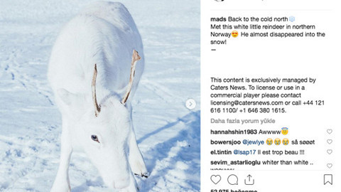 Arkadaşlarıyla birlikte doğa yürüyüşü yapan Oslolu fotoğraf sanatçısı Mads Nordsveen, Cater Haber Ajansı'na yaptığı açıklamada "Gezi fotoğrafları çekebilmek için manzara aradığım ve dağlarda gezdiğim çok olur ancak daha önce hiç böyle harika küçük bir yaratık görmemiştim" ifadelerini kullandı ve "Oldukça yakınıma geldi ve birbirimizin gözlerinin içine baktık" dedi. Nordsveen, Instagram hesabından paylaştığı fotoğrafta ise "Yeniden soğuk kuzeyde. Burada, bu küçük Ren geyiği ile karşılaştım, karda adeta görünmüyor" ifadelerine yer verdi. Fotoğrafa binlerce yorum ve beğeni geldi. Nadir görünen beyaz Ren geyikleri daha önce de İsveç'te bir fotoğraf sanatçısı tarafından çekilmişti. Sib Poijoin Mala'un çektiği kare için Öylece yolun kenarında duruyordu böylece fotoğrafını çekmem mümkün oldu.” demişti.