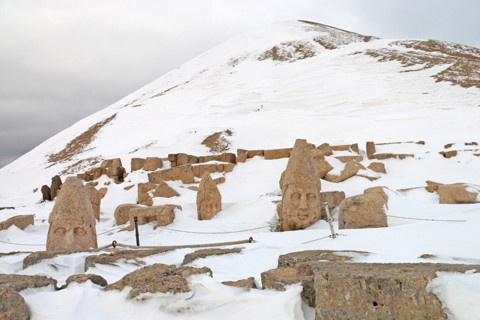 Galerinin tamamı için tıklayınızKar yağışıyla turizm sezonu kapanan Nemrut Dağı'nın doğu ve batı terasında yer alan heykeller karla örtülmeye başladı. Kar örtüsünün bazı yerlerde bir metreden fazla olması binlerce yıllık tanrı heykellerini adeta "kış uykusu"na yatırdı.