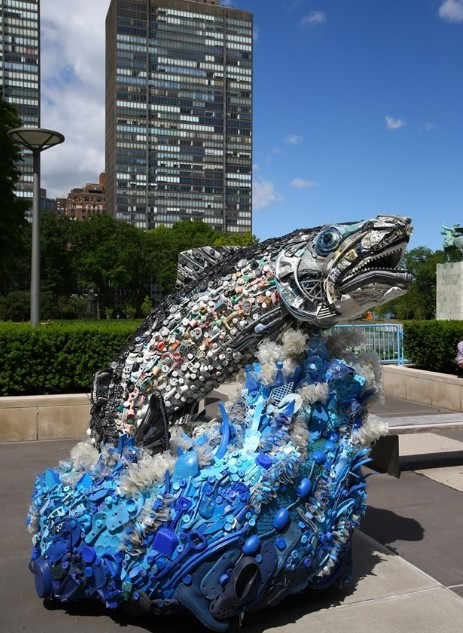 Heykeller arasında, yaklaşık 9 metre uzunluğunda ağartılmış mercan kayalığından yapılma heykel ise, 3 sokak ileride binanın ana girişinde sergileniyor.