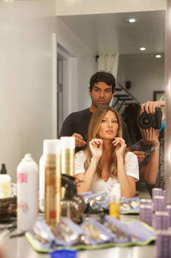 Ünlü top model Gisele Bundchen, çekim öncesi görüntülendi. Majyajdan sonra pozlar veren ünlü model, sonra da o pozları inceledi.