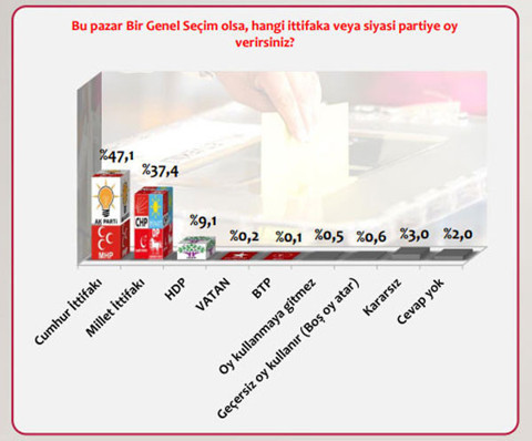Galerinin tamamı için tıklayınızReferandum sonucunu en doğru tahmin eden şirketlerden Konsensus, 24 Haziran seçimlerine ilişkin 1-28 Mayıs tarihlerinde 42 ilde 2 bin kişi ile görüşerek, seçmenin eğilimini ölçtü. Anket sonuçlarına göre, Cumhur İttifakı'nın yüzde 50,4, Millet İttifakı'nın yüzde 39,7 ve HDP'nin yüzde 9,6 oy alacağı tahmin edildi.