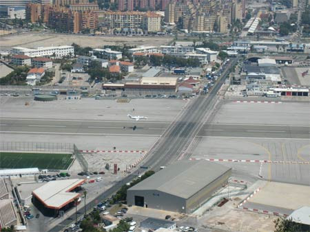 Cebelitarık Havaalanı'nda uçaklar yoldan geçiyor... Yayalar ve araçlar uçaklar kalkış ve iniş yaparken yanan kırmızı ışıkta bekliyor...
