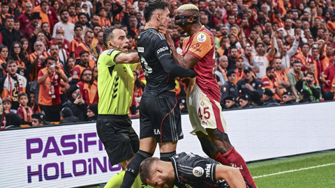 Bir pozisyonda Galatasaray oyuncusu Victor James Osimhen (45) ile Beşiktaş oyuncusu Emirhan Topçu (ortada) arasında gerginlik yaşandı.